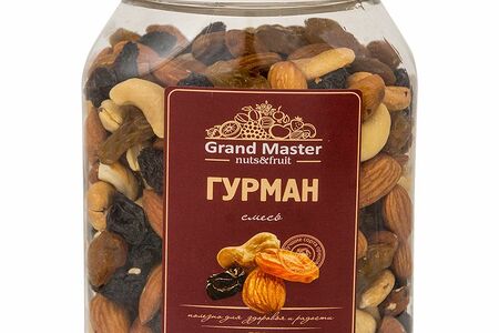 Срок годности в днях: 240Состав: Изюм, ядро кешью жареное, ядро миндаля жареное.Пищевая ценность: Калорийность: 447Белки: 10.2Жиры: 24.2Углеводы: 47.3Страна изготовления: РоссияПроизводитель: Grand Master