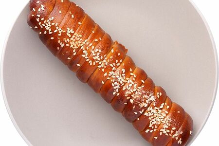 Срок годности в днях: 1Состав: Сосиска (свинина, говядина, вода, белковый стабилизатор, яичный порошок, молоко сухое обезжиренное, смесь посолочно-нитритная (соль, фиксатор окраски нитрит натрия), стабилизатор (пирофосфаты), регулятор кислотности (трифосфаты), усилитель вкуса и аромата (глутамат натрия 1-замещенный), антиокислитель (лимонная кислота), сахар, пряности (мускатный орех, кориандр, перец черный)), мука пшеничная хлебопекарная высшего сорта, масло подсолнечное рафинированное дезодорированное, сахар, соль, дрожжи хлебопекарные, семена кунжута, регулятор кислотности (гидроксид натрия).Пищевая ценность: Калорийность: 446.6Белки: 11.9Жиры: 18.8Углеводы: 57.6Страна изготовления: РоссияПроизводитель: Пекарня Перекрёсток