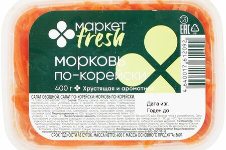 Срок годности в днях: 30Состав: Морковь свежая, масло подсолнечное, чеснок свежий, смесь специй (кориандр, перец чили молотый), регулятор кислотности (уксусная кислота), соль пищевая, консерванты (е202, е211), подсластитель (е954), усилитель вкуса и аромата (е621).Пищевая ценность: Калорийность: 100Белки: 1.1Жиры: 5.1Углеводы: 12Страна изготовления: РоссияПроизводитель: Маркет