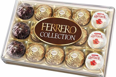 Срок годности в днях: 270Состав: Конфеты хрустящие Ferrero Rondnoir, покрытые темным шоколадом, с начинкой из крема какао и шоколадом внутри. темный шоколад (какао тертое, сахар, какао-масло, эмульгаторы: лецитины, ароматизатор), сахар, растительный жир, обезжиренный какао-порошок, лесной орех, сухая молочная сыворотка, пшеничная мука, молочный шоколад (сахар, масло какао, сухое цельное молоко, тертое какао, эмульгатор: лецитины, ароматизатор), пшеничный крахмал, растительное масло, эмульгатор: лецитины, масло какао, сывороточные белки, сухое обезжиренное молоко, разрыхлители: гидрокарбонат аммония и гидрокарбонат натрия, соль, ароматизатор. Содержит орехи, молоко, злаки, содержащие глютен, сою и продукты их переработки. Может содержать незначительное количество миндаля Конфеты хрустящие Ferrero Rocher из молочного шоколада, покрытые измельченными орешками, с начинкой из крема и лесного ореха. молочный шоколад (сахар, масло какао, тертое какао, сухое обезжиренное молоко, молочный жир, эмульгатор: лецитины, ароматизатор), лесные орехи, сахар, растительное масло, пшеничная мука, сухая молочная сыворотка, обезжиренный какао-порошок, эмульгатор: лецитины, разрыхлитель: гидрокарбонат натрия, соль, ароматизатор. Содержит орехи, молоко, злаки, содержащие глютен, сою и продукты их переработки Конфеты Raffaello. Конфеты с цельным миндальным орехом в кокосовой обсыпке. сушеная кокосовая стружка, растительные жиры, сахар, орехи миндаля сладкого, сухое обезжиренное молоко, сухая молочная сыворотка, мука пшеничная, тапиоковый крахмал, эмульгатор: лецитины, ароматизаторы, разрыхлитель: гидрокарбонат натрия, соль. Содержит орехи, молоко, злаки, содержащие глютен, сою и продукты их переработки.Пищевая ценность: Калорийность: 628Белки: 8.2Жиры: 48.6Углеводы: 49.5Страна изготовления: ГерманияПроизводитель: Ferrero Rocher