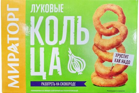Срок годности в днях: 365Состав: Лук репчатый замороженный, сухари панировочные [мука пшеничная, соль, масло растительное подсолнечное рафинированное дезодорированное, дрожжи, сахар, вода питьевая, эмульгаторы (е471, е472е), антиокислитель е300], масло растительное подсолнечное рафинированное дезодорированное (содержит антиокислитель е306), вода питьевая, мука (пшеничная, из твердых сортов пшеницы, рисовая), крахмал кукурузный, соль, сахар, загустители (е401, е425(i)), разрыхлители (e450(i), e500(ii)), стабилизатор е1420, глютен пшеничный, белок яичный сухой, перец черный молотый.Пищевая ценность: Калорийность: 239.7Белки: 4.7Жиры: 10Углеводы: 32.8Страна изготовления: РоссияПроизводитель: Мираторг