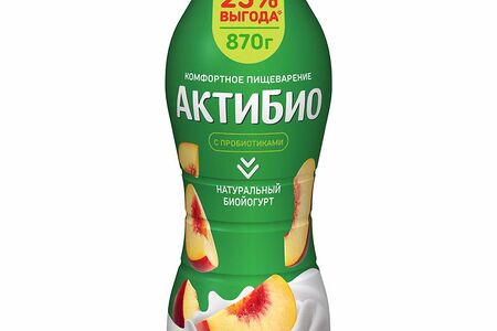 Срок годности в днях: 35Состав: Нормализованное молоко, восстановленное молоко из сухого молока, наполнитель (вода, сахарный сироп, персик, сахар, концентрированное пюре персика, кукурузный крахмал, ароматизатор натуральный, лимонный сок концентрированный, загуститель – пектины, краситель – каротины), сахар, йогуртовая закваска, бифидобактерии B. Lactis*. Может содержать следы глютена и фрагменты косточки персика. * Эксклюзивные бифидобактерии B.Lactis CNCM I-2494.Пищевая ценность: Калорийность: 71Белки: 2.9Жиры: 1.5Углеводы: 11.4Страна изготовления: РоссияПроизводитель: Актибио