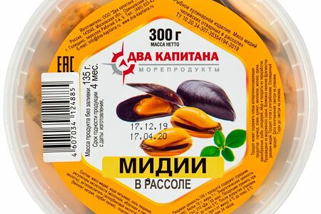 Срок годности в днях: 120Состав: Мясо мидий, вода питьевая, соль пищевая, регуляторы кислотности (молочная, яблочная и лимонные кислоты), антиокислитель (аскорбиновая кислота), консерванты (бензоат натрия, сорбат калия), подсластитель Е954.Пищевая ценность: Калорийность: 50Белки: 10Жиры: 1Страна изготовления: РоссияПроизводитель: Два капитана