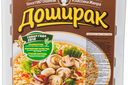 Срок годности в днях: 365Состав: Лапша: пшеничная мука в/с, масло растительное, модифицированный картофельный крахмал, соль, пищевая добавка эмульгатор «к-300а» (сорбит, соевое масло, лецитины), клейковина, комплексная пищевая добавка стабилизатор «премикс» (карбонат калия, гуаровая камедь, полифосфат натрия), приправы смешанные (сахар, экстракт дрожжей, растительный протеин, лук, порошок соевого соуса), сушеная ламинария (порошок), лук сушеный. Бульон-приправа: соль, бульонная основа (крахмал кукурузный, порошок грибов, лактоза, перец красный, молочная сыворотка, мальтодекстрин, соус соевый, перец острый, чеснок, перец черный), усилитель вкуса (глутамат натрия), сахар, глюкоза. Приправа из сушеных овощей: соевый текстурат, морковь, лук, водоросли сушеные (хлопья). Продукт содержит глютен, продукты переработки молока, сою и продукты её переработки.Пищевая ценность: Калорийность: 450Белки: 8Жиры: 20Углеводы: 60Страна изготовления: РоссияПроизводитель: Доширак