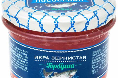 Срок годности в днях: 365Состав: Икра-зерно горбуши, соль пищевая, масло подсолнечное рафинированное дезодорированное, консерванты(сорбиновая кислота, бензоат натрия).Пищевая ценность: Калорийность: 263Белки: 32Жиры: 15Страна изготовления: РоссияПроизводитель: Сахалинский Деликатес