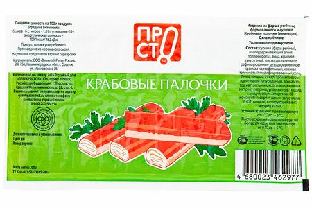 Срок годности в днях: 75Состав: Сурими (фарш из зоологических видов рыб: желтополосая сардинелла, тумбиль, влагоудерживающий агент: полифосфаты, вода, крахмал кукурузный, масло растительное, крахмал картофельный, ароматизаторы, соль, загуститель: дикрахмалфосфат, сахар, белок яичный, стабилизаторы: каррагинан, красители: кармины, экстракт паприки. Содержит сою и глютен. Возможно наличие следов ракообразных и продуктов из них.Пищевая ценность: Калорийность: 109.1Белки: 6Жиры: 1Углеводы: 19Страна изготовления: РоссияПроизводитель: Пр!ст
