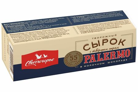 Срок годности в днях: 30Состав: Творог (молоко цельное, молоко восстановленное из сухого молока, масло сливочное, закваска, молокосвёртывающий ферментный препарат), сахар белый, шоколад молочный (сахар, какао-масло, молоко сухое цельное, какао тертое, эмульгатор: соевый лицетин, ароматизатор натуральный-ваниль), сыр твердый «Палермо» (молоко нормализованное пастеризованное, соль пищевая, закваска культур молочнокислых микроорганизмов, молокосвёртывающий ферментный препарат микробного происхождения, уплотнитель – хлорид кальция), масло сливочное.Пищевая ценность: Калорийность: 395Белки: 9.8Жиры: 25.6Углеводы: 31.4Страна изготовления: РоссияПроизводитель: Свитлогорье