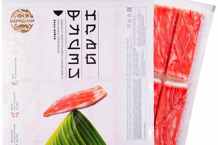 Срок годности в днях: 75Состав: Рыбный фарш «Сурими» (фарш из южной путассу, из минтая, сахар, влагоудерживающие агенты сорбит и полифосфаты), вода, яичный белок, крахмал пшеничный, крахмал картофельный, ароматизаторы пищевые (глюкозный сироп, вкусоароматические вещества, соевый соус (вода, соя, пшеница, соль), усилители вкуса и аромата Е621 и Е635), сахар, соль (содержит антислеживающий агент Е536), масло подсолнечное рафинированное дезодорированное, стабилизатор карбонат кальция, красители натуральные (кармины и экстракт паприки), регулятор кислотности трифосфат натрия и влагоудерживающий агент полифосфат натрия. Возможно наличие следов молока.Пищевая ценность: Калорийность: 95Белки: 10.2Жиры: 0.7Углеводы: 11.7Страна изготовления: РоссияПроизводитель: Меридиан