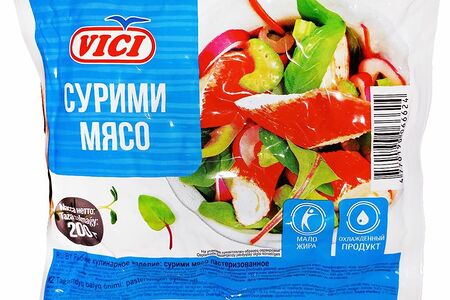 Срок годности в днях: 75Состав: Сурими ( фарш рыбный из зоологических видов рыб: красный нитепёр (Nemipterus japonicus), желтополосая сардинелла (Sardinella gibbosa); влагоудерживающий агент: полифосфаты); вода; крахмал кукурузный; масло растительное; крахмал картофельный; соль; загуститель: дикрахмалфосфат; белок яичный; сахар; ароматизаторы; стабилизатор: каррагинан; красители (кармины, экстракт паприки). Возможно наличие следов ракообразных и продуктов из них.Пищевая ценность: Белки: 5.7Жиры: 2Углеводы: 16.3Страна изготовления: РоссияПроизводитель: Vici