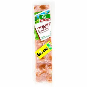 Срок годности в днях: 45Состав: Филе куриной грудки, вода, смесь посолочно-нитритная (соль, фиксатор окраские250), стабилизаторы: е450, е452, регуляторы кислотности е451, e262i, е331iii, агент влагоудерживающий е325, антиокислитель е301, клетчатка пшеничная.Пищевая ценность: Калорийность: 107Белки: 17Жиры: 3Углеводы: 3Страна изготовления: РоссияПроизводитель: Маркет