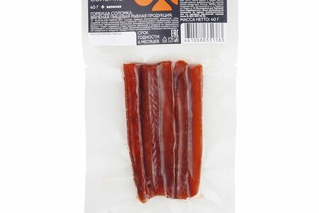 Срок годности в днях: 180Состав: Горбуша (Oncorhynchus gorbuscha), соль пищевая, сахар, усилитель вкуса и аромата - глутамат натрия 1-замещенный, глютен пшеничный, ароматизатор коптильный, консерванты (бензоат натрия, сорбат калия). Продукт может содержать следы кунжута, моллюсков и продукты их переработки. Произведено из мороженого сырья. Допускается появление белого солевого налета на поверхности продукта. Продукт готов к употреблению. Упаковано под вакуумом.Пищевая ценность: Калорийность: 230Белки: 7Жиры: 40Углеводы: 2Страна изготовления: РоссияПроизводитель: Маркет
