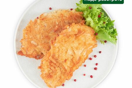 Срок годности в днях: 5Состав: Филе грудки куриное, батон (сожержит глютен), меланж яичный, масло подсолнечное, молоко, мука пшеничная, соль, специи, регуляторы кислотности.Пищевая ценность: Калорийность: 202Белки: 16.8Жиры: 7.9Углеводы: 21.4Страна изготовления: РоссияПроизводитель: Шеф Перекресток