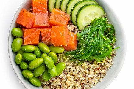 Срок годности в днях: 5Состав: Салат – киноа отварная, огурцы, лосось слабосоленый, бобы эдамамэ, салат из морских водорослей «чука», лимон, кунжутное масло, кунжут, паприка; соус – масло подсолнечное, пюре из манго, соль, сахар, сок лимона, перец чили, имбирь.Пищевая ценность: Калорийность: 170Белки: 6.4Жиры: 10.4Углеводы: 12.6Страна изготовления: РоссияПроизводитель: Шеф Перекресток