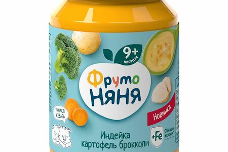Срок годности в днях: 540Состав: вода, картофель, морковь, мясо индейки, мука рисовая, масло растительные, брокколи, лук репчатый, восстановленный лимонный сок, соль йодированная, железа (III) пирофосфат.Пищевая ценность: Калорийность: 65Белки: 2.5Жиры: 3.2Углеводы: 6.5Страна изготовления: РоссияПроизводитель: ФрутоНяня