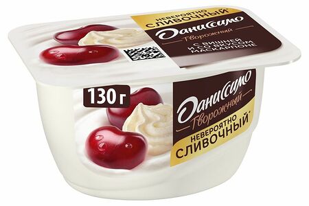 Срок годности в днях: 45Состав: Творог обезжиренный, наполнитель (вода, вишня,сахар, крахмал кукурузный, молоко цельное сгущенное с сахаром, сок черной моркови концентрированный, комплексная пищевая добавка «сырный порошок маскарпоне» (мальтодекстрин, сухой сыр Маскарпоне (солёное кислосливочное масло, молочный белок, сухая пахта), сырный порошок (сыр, эмульгирующая соль – орто-Фосфат натрия 2-замещенный), натуральный ароматизатор, соль, антислеживающий агент – диоксид кремния аморфный), регулятор кислотности – цитрат натрия 3-замещенный, стабилизатор – пектины, ароматизаторы), сливки, обезжиренное молоко, сахар. может содержать фрагменты косточки вишни, яйца куриного, глютена, соевого лецитина, орехов.Пищевая ценность: Калорийность: 135Белки: 5.6Жиры: 5.2Углеводы: 16Страна изготовления: РоссияПроизводитель: Даниссимо