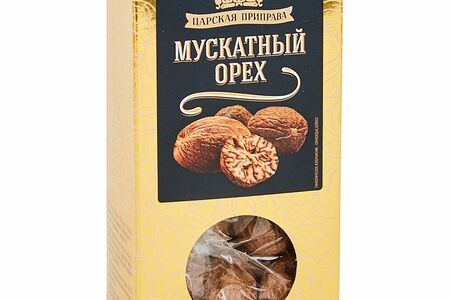 Срок годности в днях: 540Состав: Мускатный орех целый.Пищевая ценность: Калорийность: 460Белки: 29Жиры: 36Углеводы: 6Страна изготовления: РоссияПроизводитель: Царская приправа