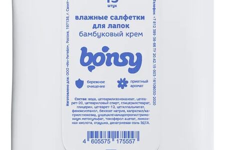 Влажные салфетки Bonsy для ухода за лапами, с ароматом бамбукового крема, 15 шт. доставка