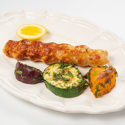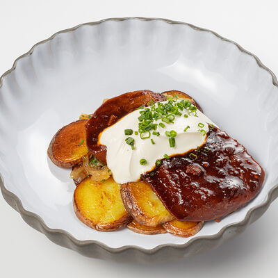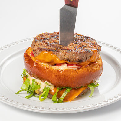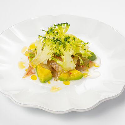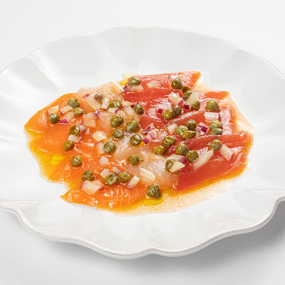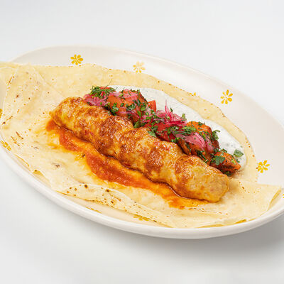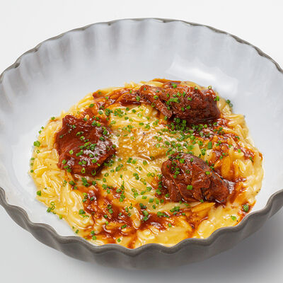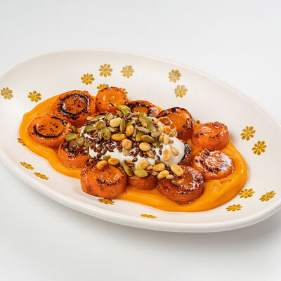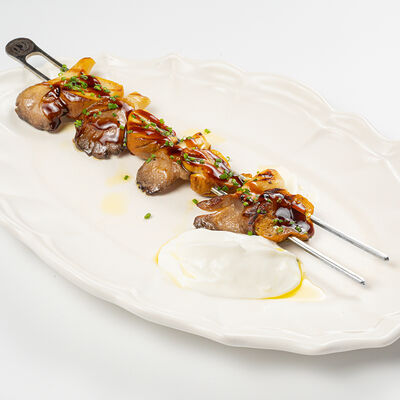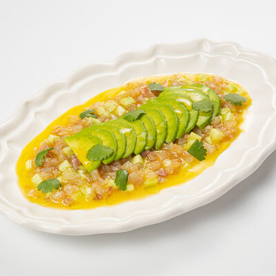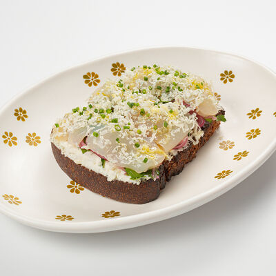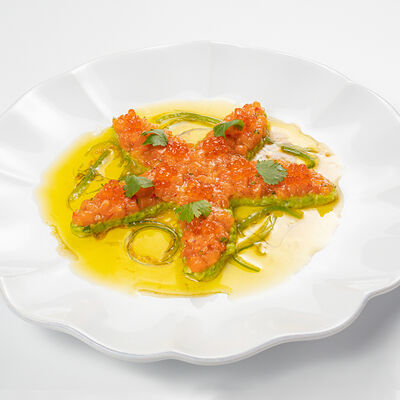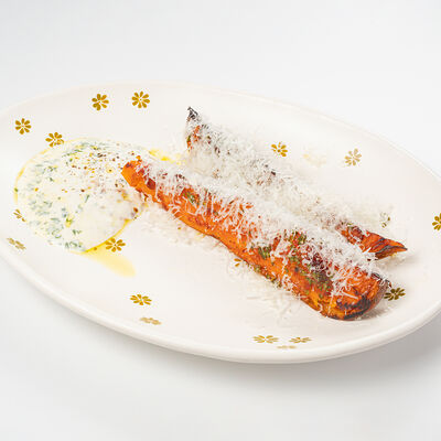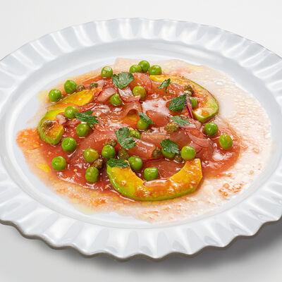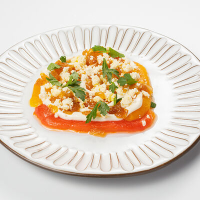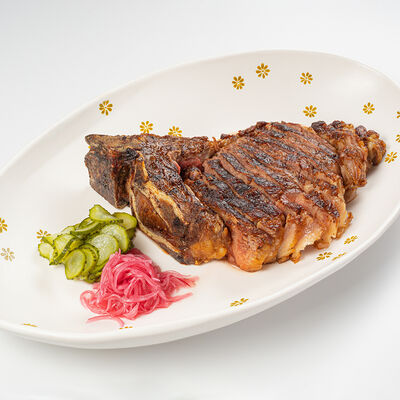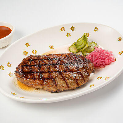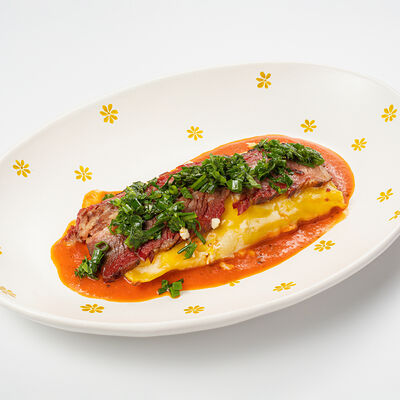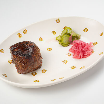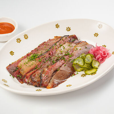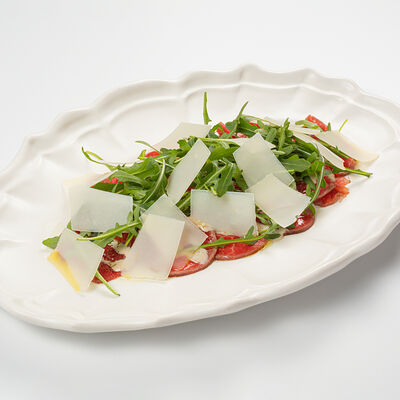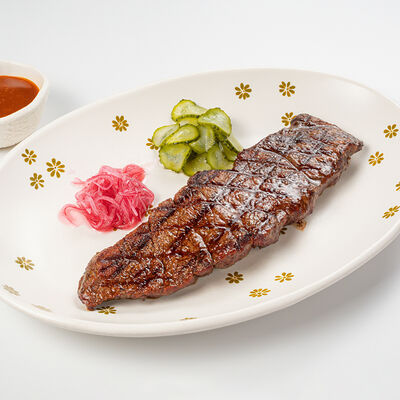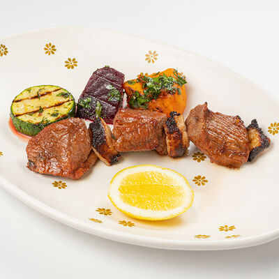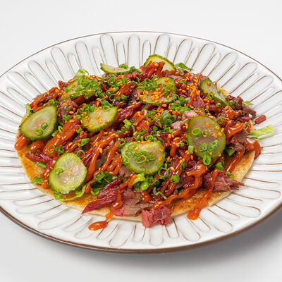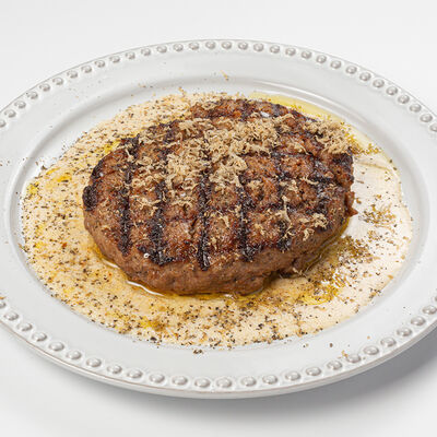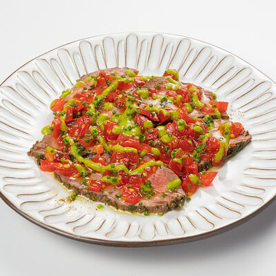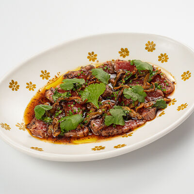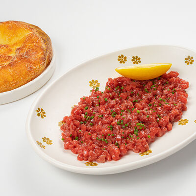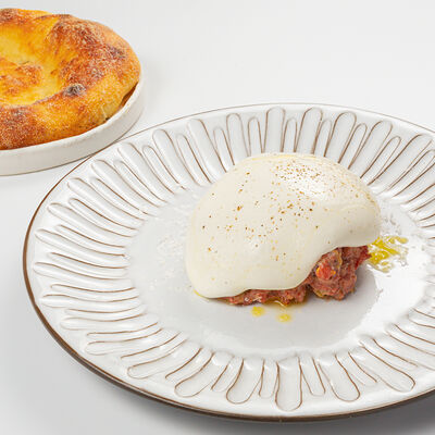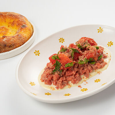 Кострец, соус на основе соевого соуса, оливкового масла и васаби, томаты, петрушка, сыровяленая говядина, соус тахини (греческий йогурт, белый кунжут, оливковое масло), лепешка. На тарелку выкладываем соус тахини, тартар в заправке на основе соевого соуса, оливкового масла и васаби, с добавлением томатов и петрушки. Сверху натираем сыровяленой говядиной. Подается с лепешкой