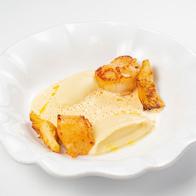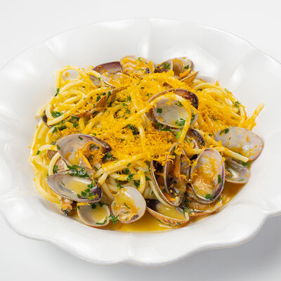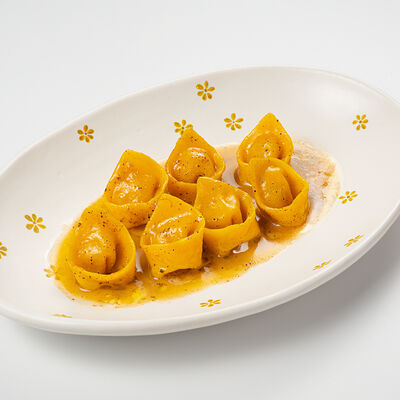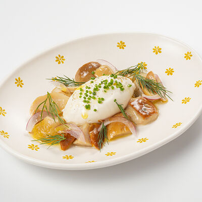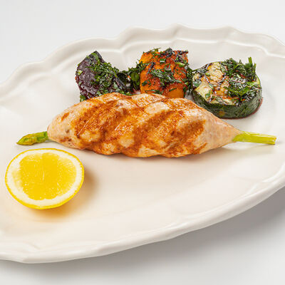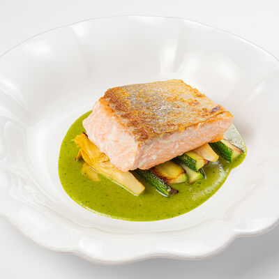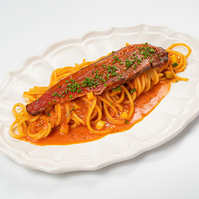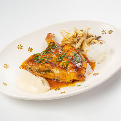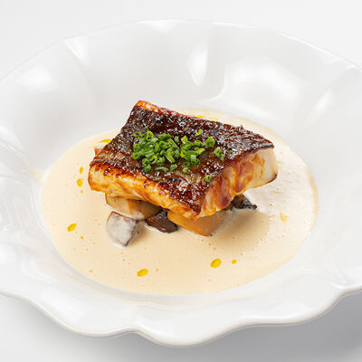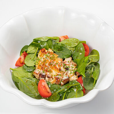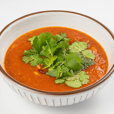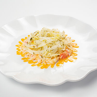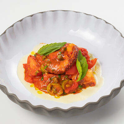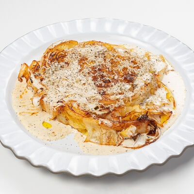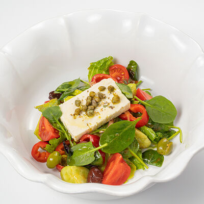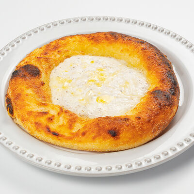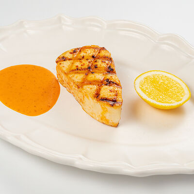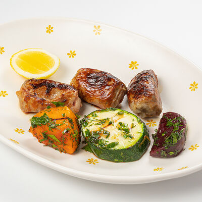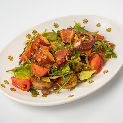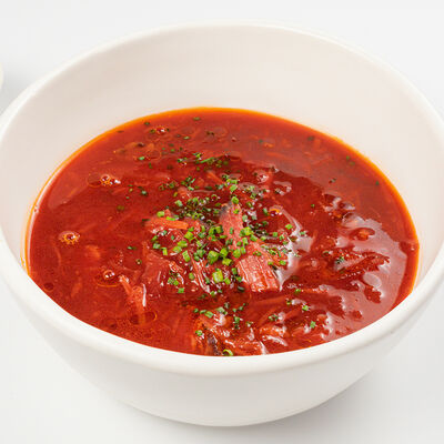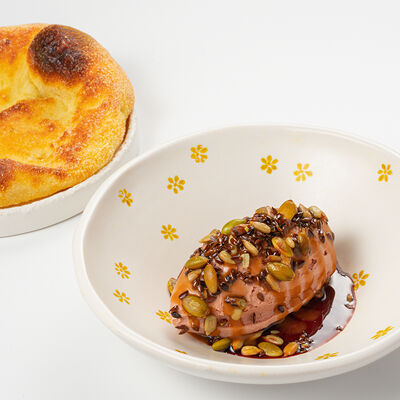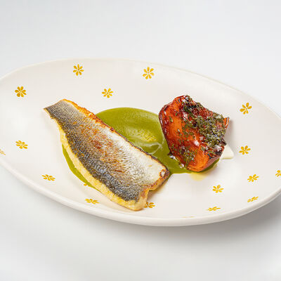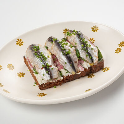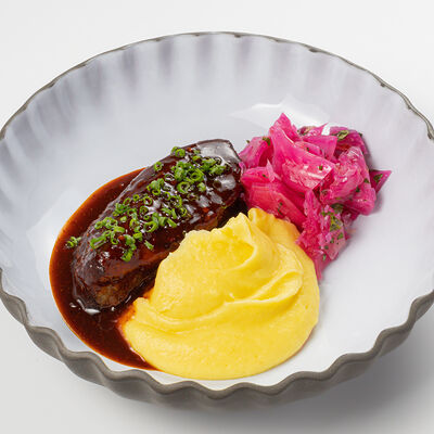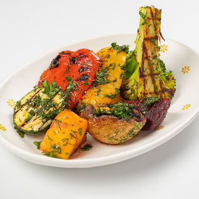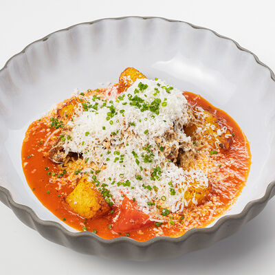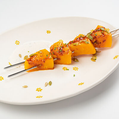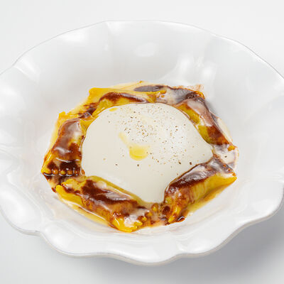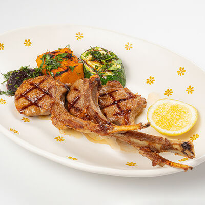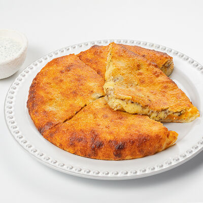 Кострец, соус на основе соевого соуса, оливкового масла и васаби, томаты, петрушка, сыровяленая говядина, соус тахини (греческий йогурт, белый кунжут, оливковое масло), лепешка. На тарелку выкладываем соус тахини, тартар в заправке на основе соевого соуса, оливкового масла и васаби, с добавлением томатов и петрушки. Сверху натираем сыровяленой говядиной. Подается с лепешкой