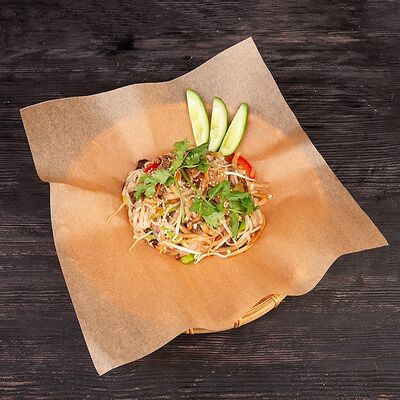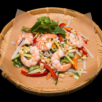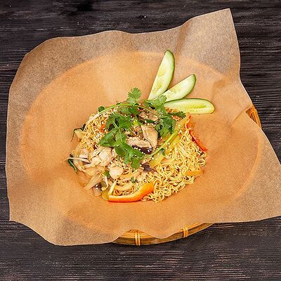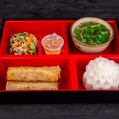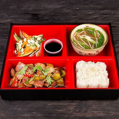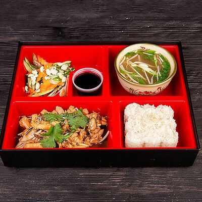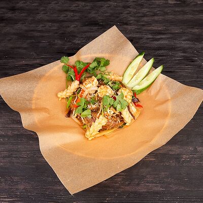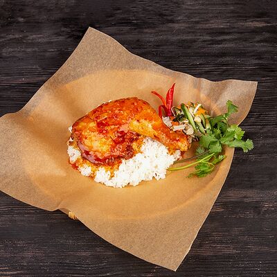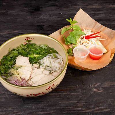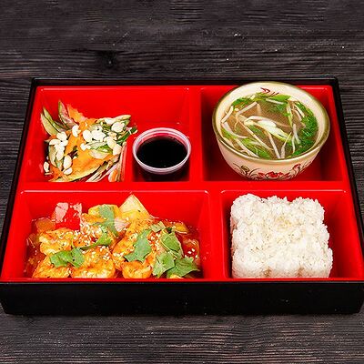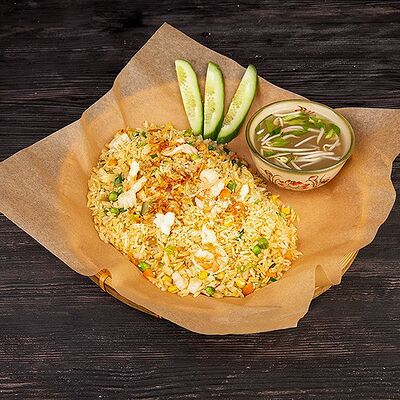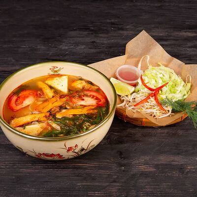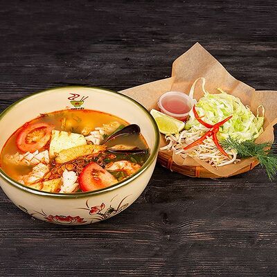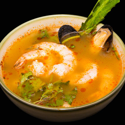 Кисло-острый суп на основе куриного бульона с креветками, кальмарами, мидиями, кокосовым молоком, шампиньонами, кинзой и паровым рисом