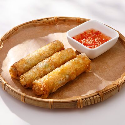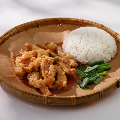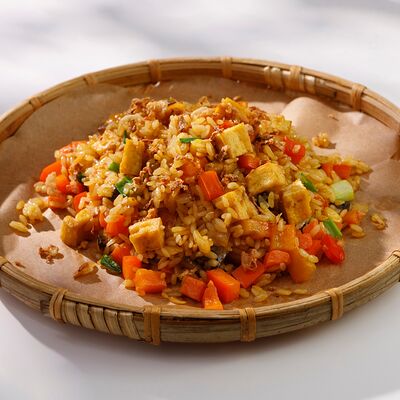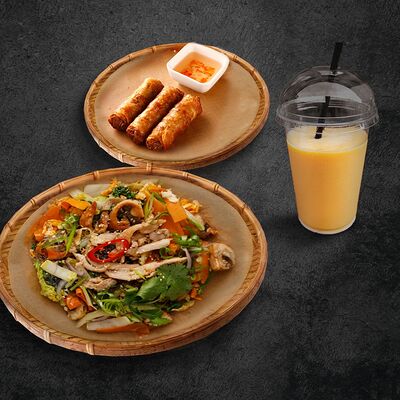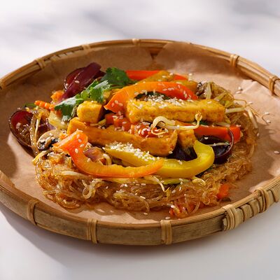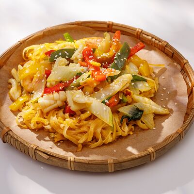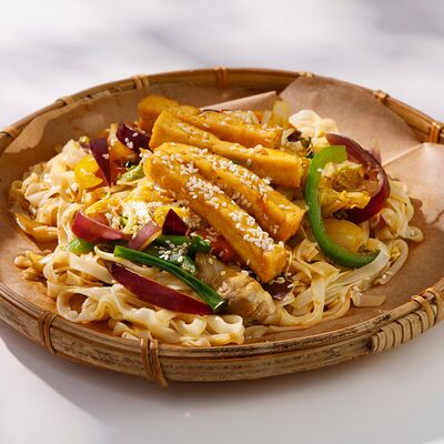 Рисовая лапша, обжаренная с курицей, пекинской капустой, морковью, грибами, ростками бобов, луком и кунжутом в соевом соусе