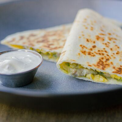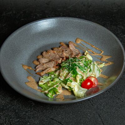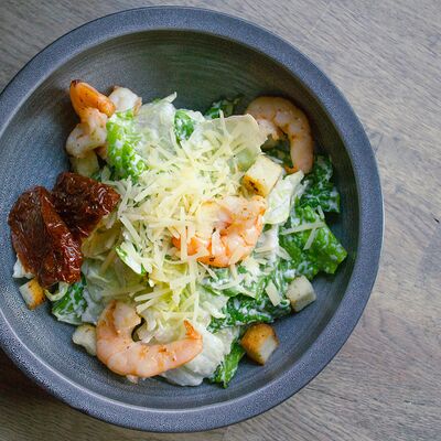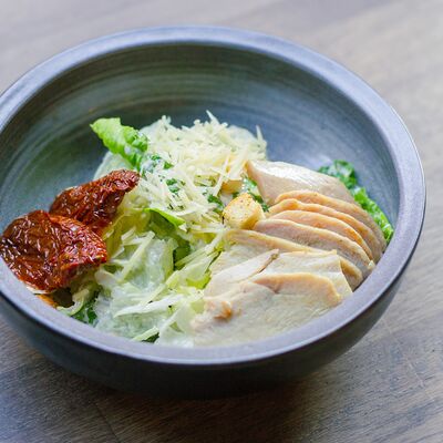 Микс салатных листьев романо, айсберг, соус Цезарь, пармезан тертый, вяленый томат, курица сувид, гренки