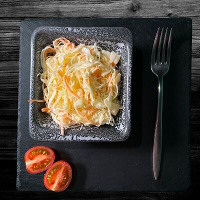 Молодая капуста, морковь, персиковый нектар, кусочки ананаса, домашний майонез