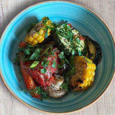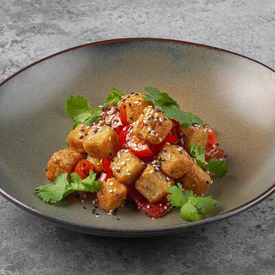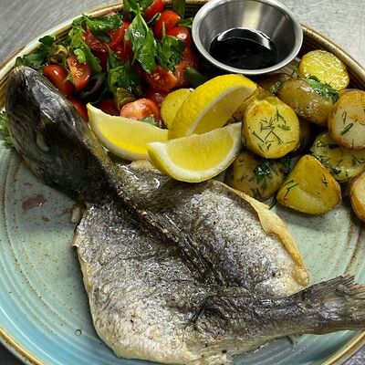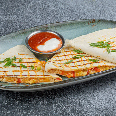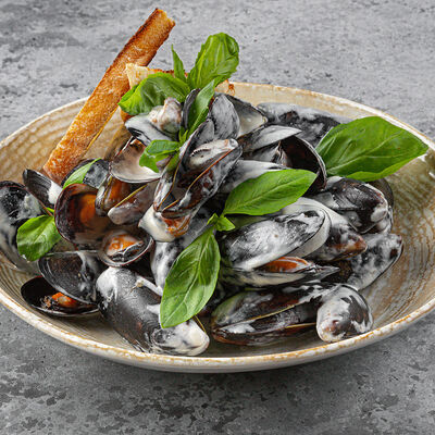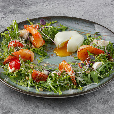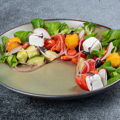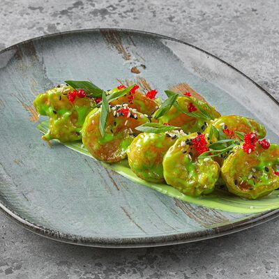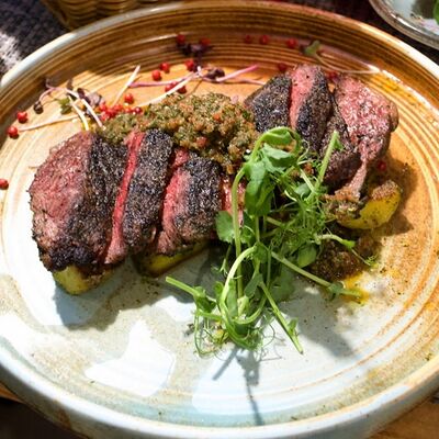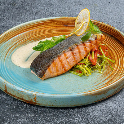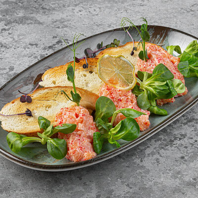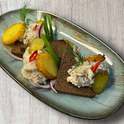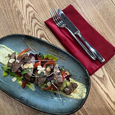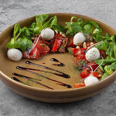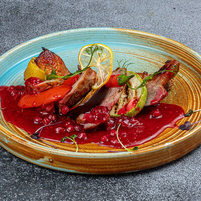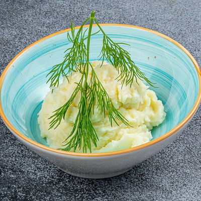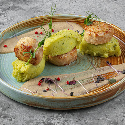Фарш из цесарки, картофельное пюре, кресс-салат, соус песто, сливки
