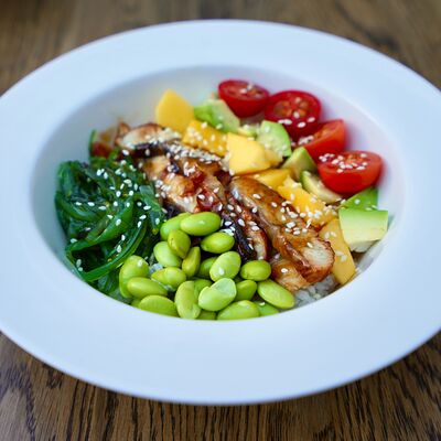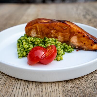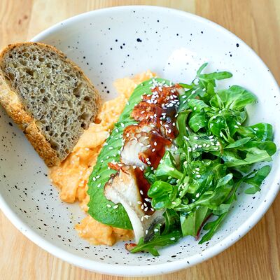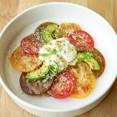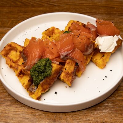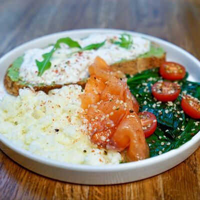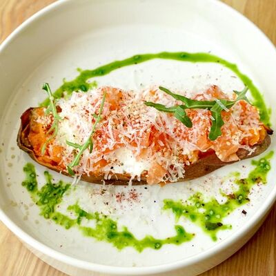 Запечённый батат, лосось слабой соли и страчателла доставка