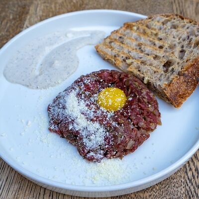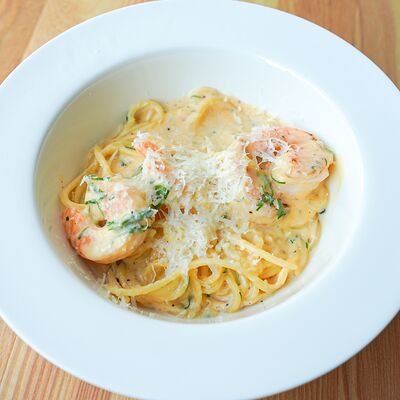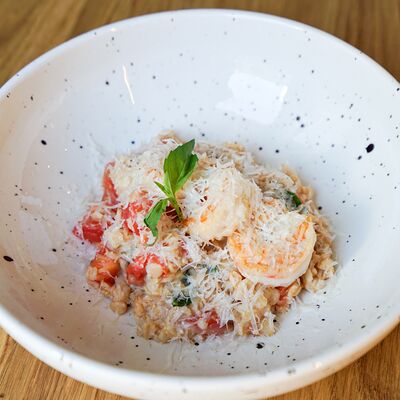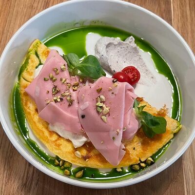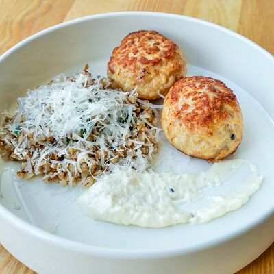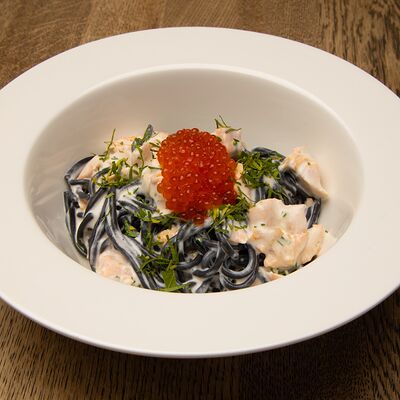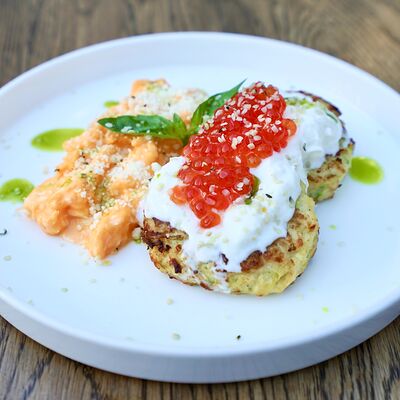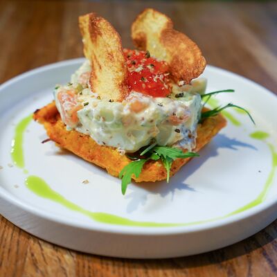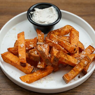 Батат, лосось, страчателла, сыр пекорино