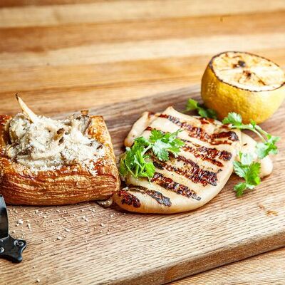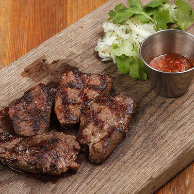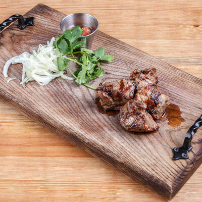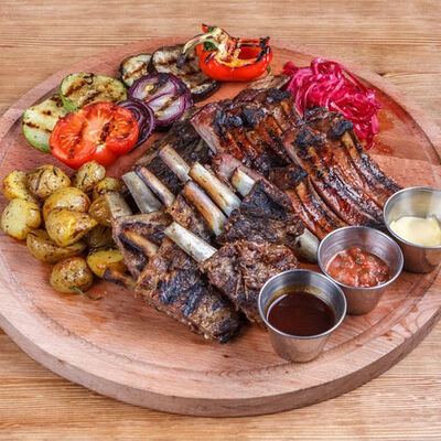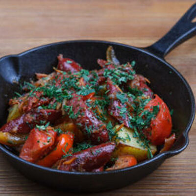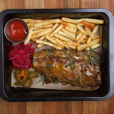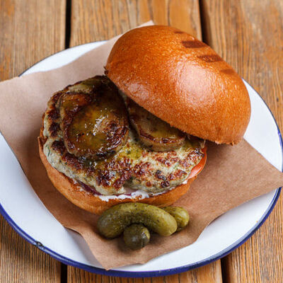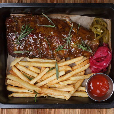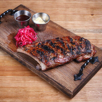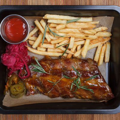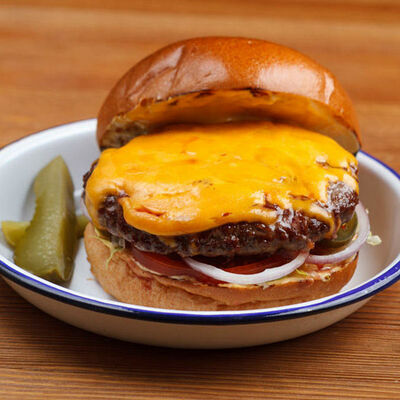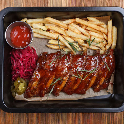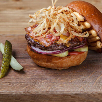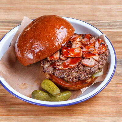 Котлета говяжья для бургера, булочка для бургера, бекон сырокопченый, огурцы маринованные, соус барбекю ( кетчуп, сахар, соус соевый, мед, чеснок свежий, масло сливочное, жидкий дым, перец чили), помидоры, масло подсолнечное, соль