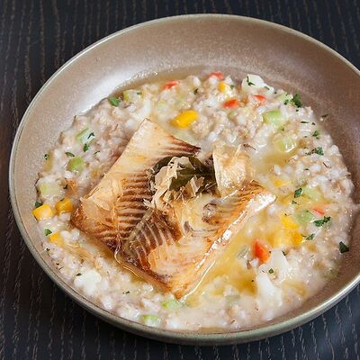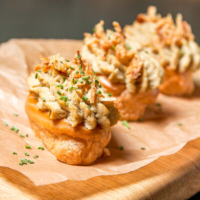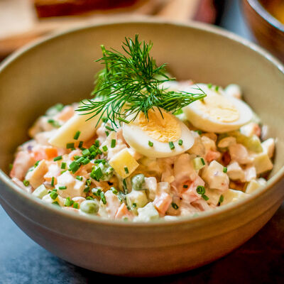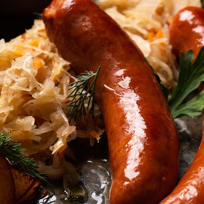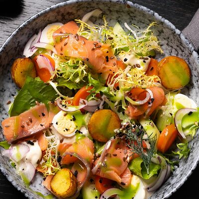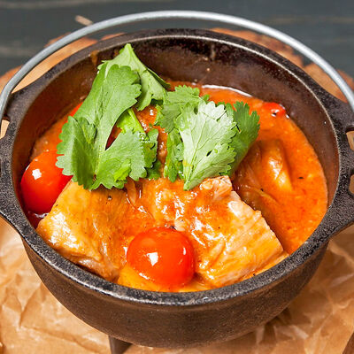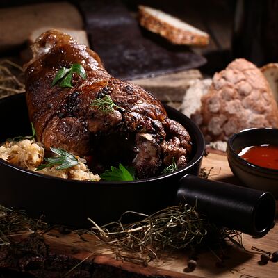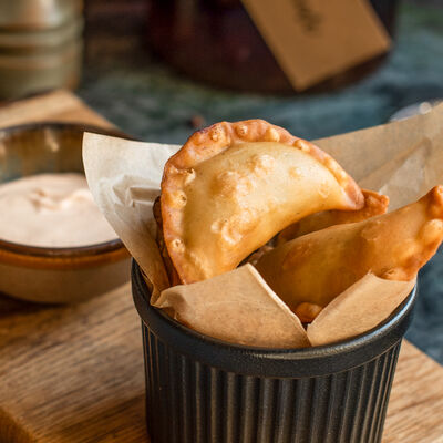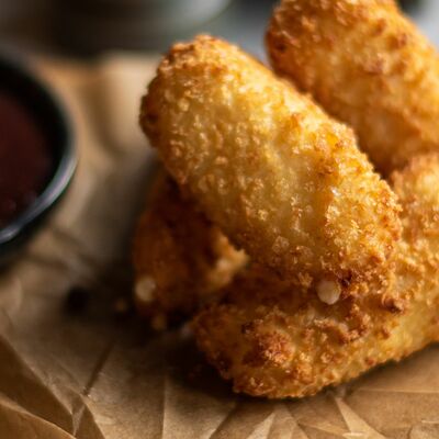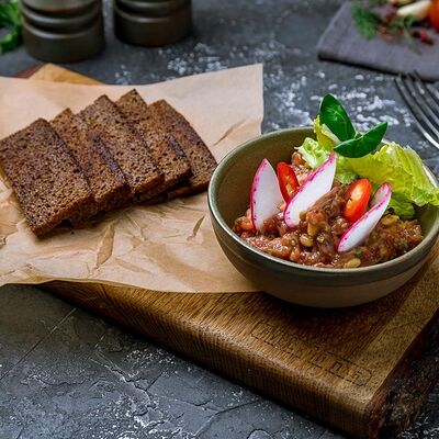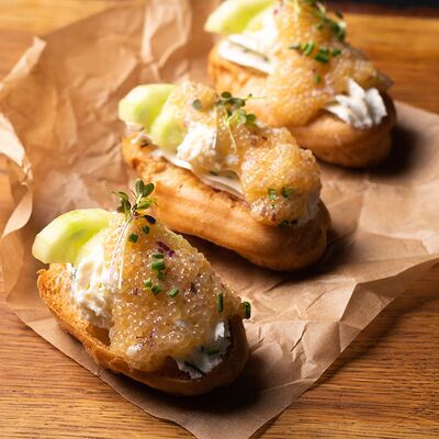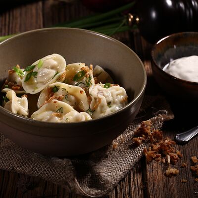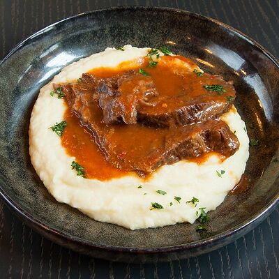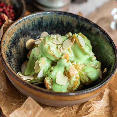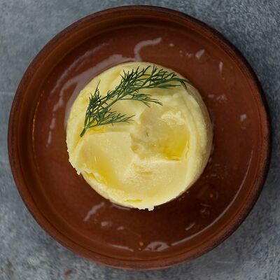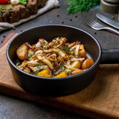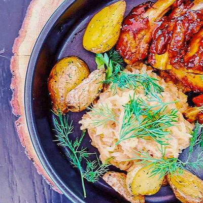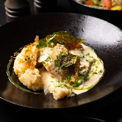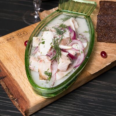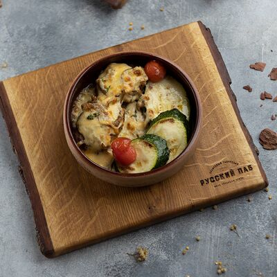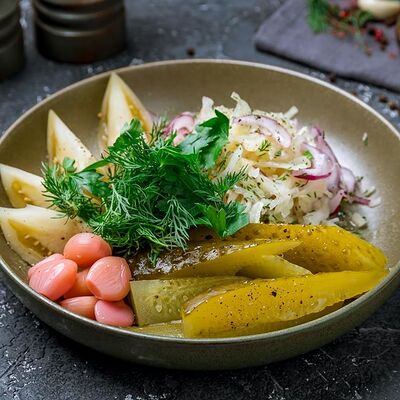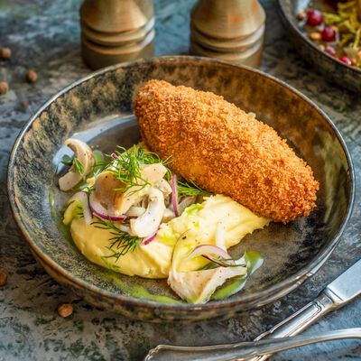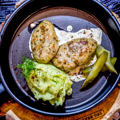 Картофельное пюре, огурцы соленые, щучьи котлеты, соус белое вино, зелень