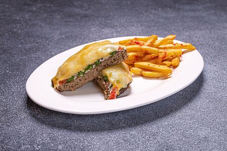 Сочная фаршированная говядина под нежным плавленным сыром, розовыми помидорами и зеленью, подается с картофелем фри Продавец: ИП Изиев Хамид Уллубиевич (056201967792) 367009, Дагестан респ, Махачкала г, Советский р-он, ул Керимова, дом 15Б, корп 4, кв 87 322057100072522