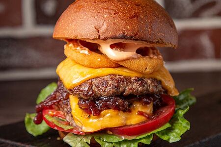 Булочка бриошь, котлеты из мраморной говядины (2 шт.), листья салата романо, томаты, красный лук карамелизированный, сыр чеддер, луковые кольца, соус фирменный. Продавец: ИП Макаров Михаил Валентинович (773405838865) г. Москва, ул. Берзарина, д. 28а, к. 4, кв. 129 321774600171539