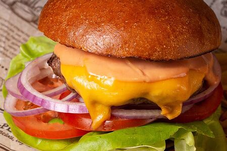 Булочка бриошь, котлета из мраморной говядины, томат, салат айсберг, сыр чеддер, красный лук, соус 1000 островов, трюфельный соус. Продавец: ИП Макаров Михаил Валентинович (773405838865) г. Москва, ул. Берзарина, д. 28а, к. 4, кв. 129 321774600171539
