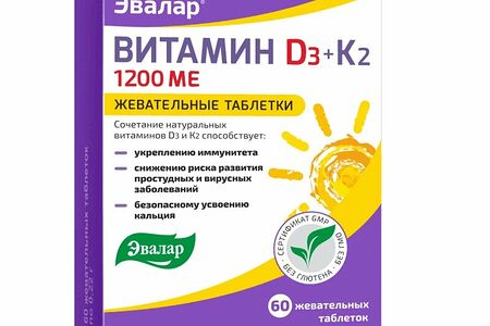 Эвалар Витамин Д3 1200МЕ+К2 таб.жев.№60 доставка