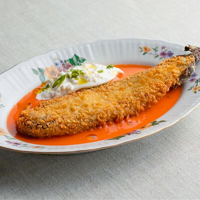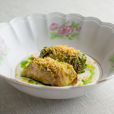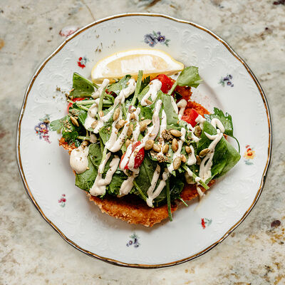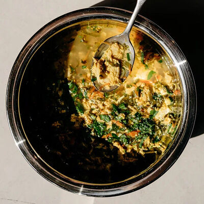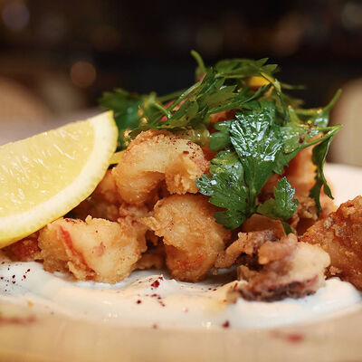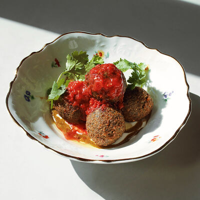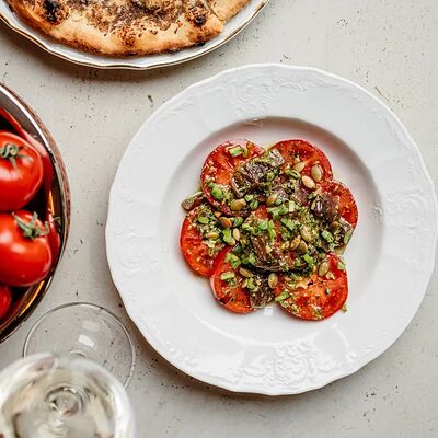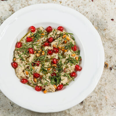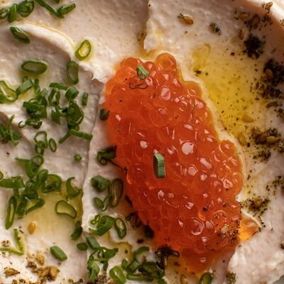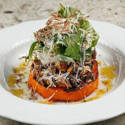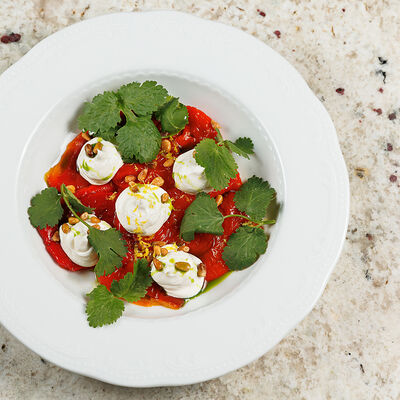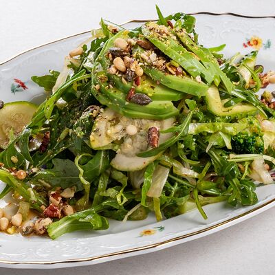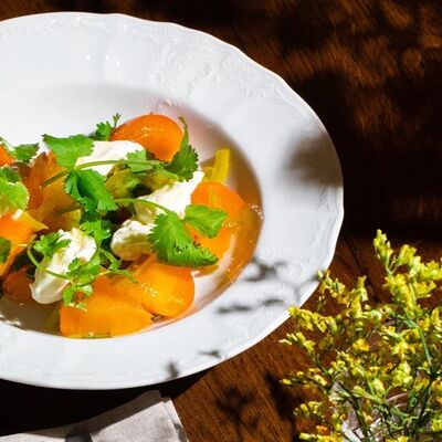 Свежее манго и мягкая хурма создают баланс вкусов, а молодой сыр страккино придаёт сливочные нотки и делает салат более питательным. Соленые лимоны, маринованный зеленый перец чили, винoград, кинза, сыр страккино