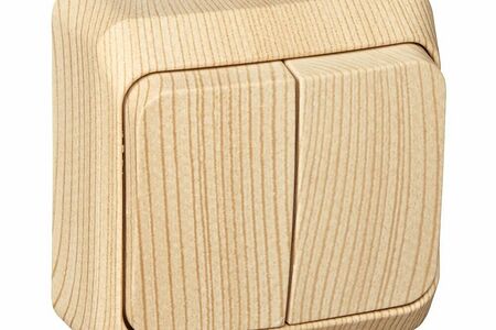 Выключатель Systeme Electric (ранее Systeme Electric) ЭТЮД (сосна, открытой установки) двухклавишный предназначен для применения в сетях до 250В, на ток до 10А. Две клавиши позволяют управлять двумя источниками света с одной точки. Изделия цвета Сосна обладают уникальным рисунком, напоминающим древесный сруб. Он прост в установке и удобен применении.