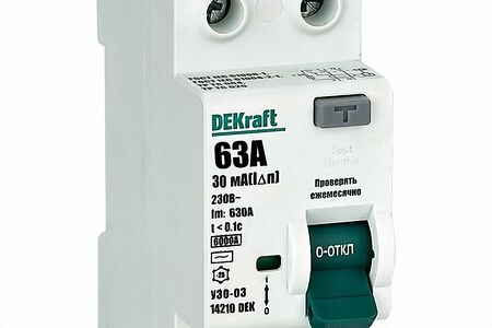 Выключатель дифференциального тока DEKraft 2P 63А 30мА тип AC 6кА УЗО-03 14210DEK не обеспечивает защиту от перегрузки и токов короткого замыкания, он используется исключительно в сочетании с автоматическим выключателем, либо предохранителем.