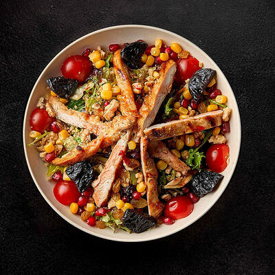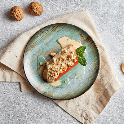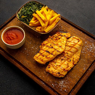 Лосось, картофельное пюре со шпинатом, гранатовый соус, лимон