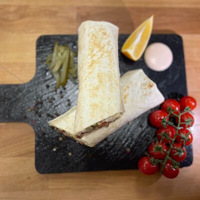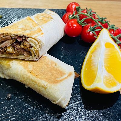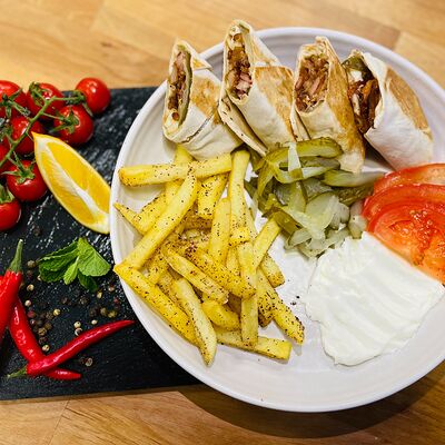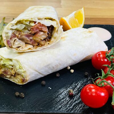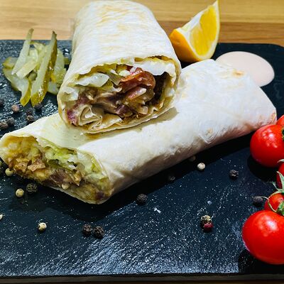 Куриное филе, капуста, свежие помидоры, соленые огурцы, фирменный соус (соевый соус, белый соус, арабские специи), чесночный соус, лаваш тонкий