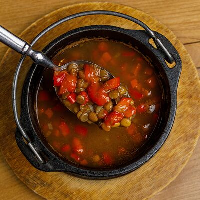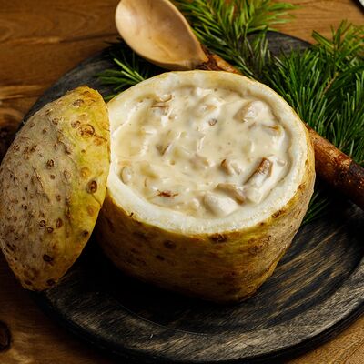 Картофель, Грибы белые, Грузди белые, Соленые огурцы, Молоко соевое, Масло растительное, Лук репчатый, Мука, крахмал, Кресс-салат, Соль, перец