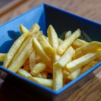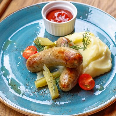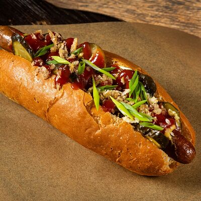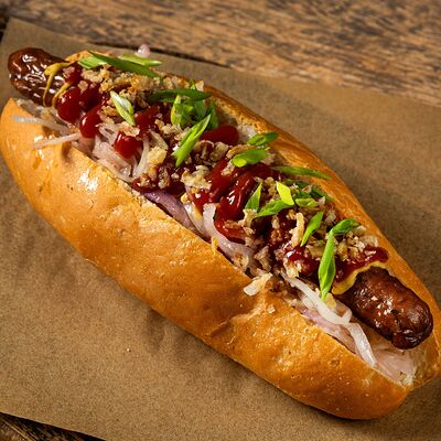 Булочка бриошь, колбаска подкопчённая из свинины, маринованный огурец, горчица дижонская, кетчуп, лук зеленый, лук фри