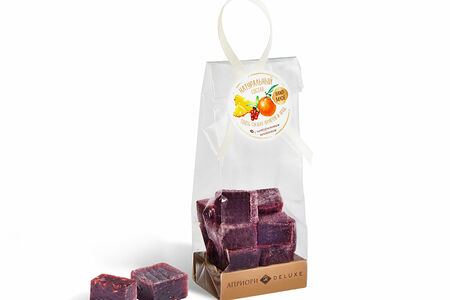 Состав: наполнитель фруктово-ягодный (сахар, брусника, влагоудерживающие агенты: глицерин, сорбит; загустители: пектины, гуаровая камедь, камедь рожкового дерева, ксантановая камедь; регуляторы кислотности: лимонная кислота, цитраты натрия, цитраты кальция; вода, натуральный ароматизатор, консервант: сорбат калия; краситель: кармины), сахар, патока крахмальная карамельная, кусочки клубники сублимационной сушки, агент желирующий: яблочный пектин; пищевое волокно пшеничное, порошок малины сублимационной сушки, регуляторы кислотности: лимонная кислота, цитрат натрия; ароматизатор. Может содержать незначительное количество орехов, молочных и яичных продуктов. Содержит подсластитель. При чрезмерном употреблении может оказывать слабительное действие.
