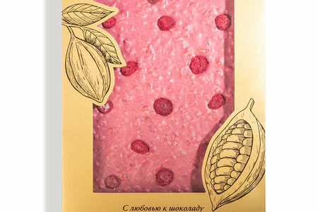 Нежный белый шоколад со сливочным вкусом, дополненный кусочками спелой малиной