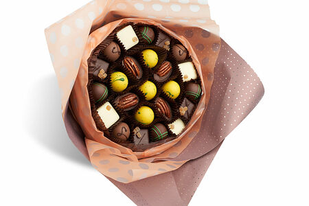 Изящный подарок из конфет ручной работы! В составе букета ассорти конфет ручной работы: Лимонный смузи; Шоколадный ганаш-крем с пеканом и карамелью; Апельсиновый марципан; Трюфель с карамелью; Мятный мусс; Апельсиновый мармелад в горьком шоколаде