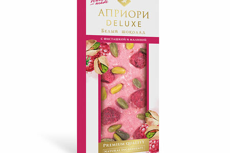 Априори Deluxe - подарочный шоколад из коллекции фабрики Верность Качеству. Малиновый шоколад - новая вариация белого шоколада в сочетании с натуральной малиной. Шоколад дополнен фисташкой и сублимированной малиной, полностью сохраняющей яркий вкус свежих ягод. Декорирован вручную