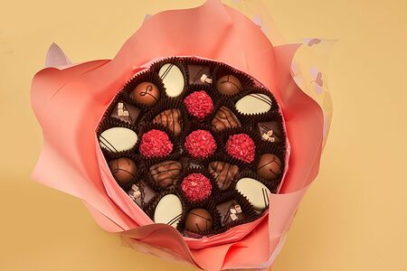 Изящный подарок из конфет ручной работы! В составе букета ассорти конфет ручной работы: Малиновый мусс; Пралине с карамелизованными орехами; Кокосовое наслаждение; Брусничный мармелад; Трюфель с карамелью