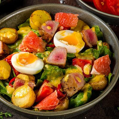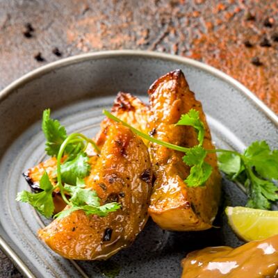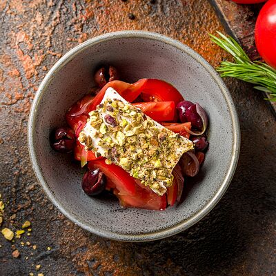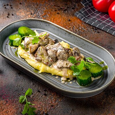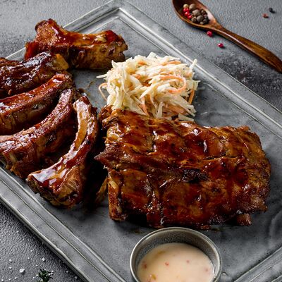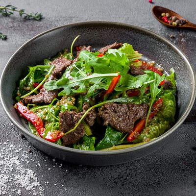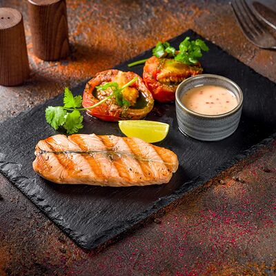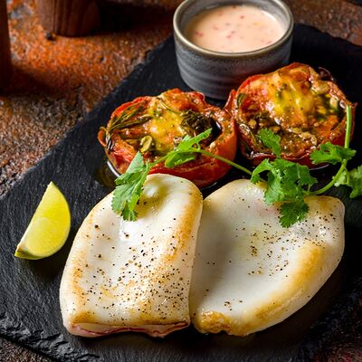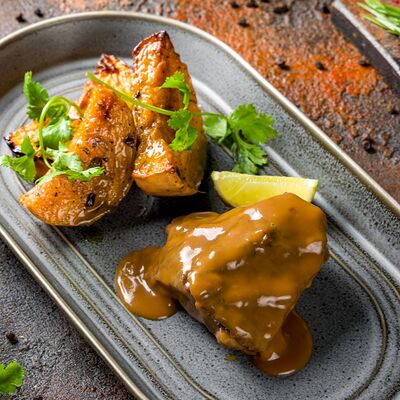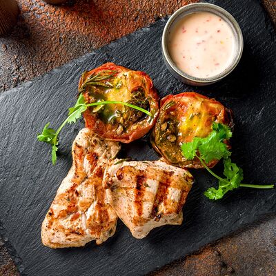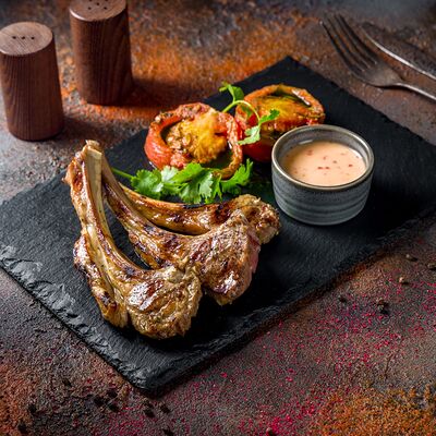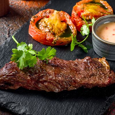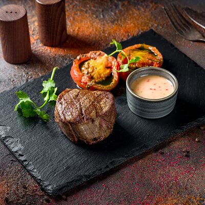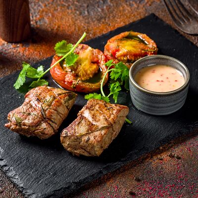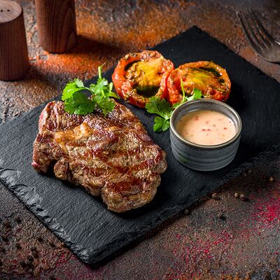 Стейк из толстого края спинно-реберной части говядины, томаты конфи, соус кисло-сладкий