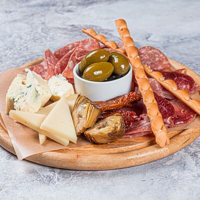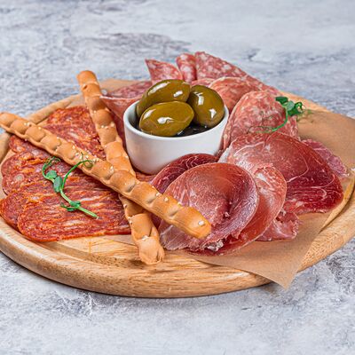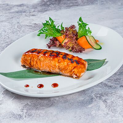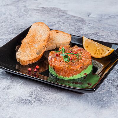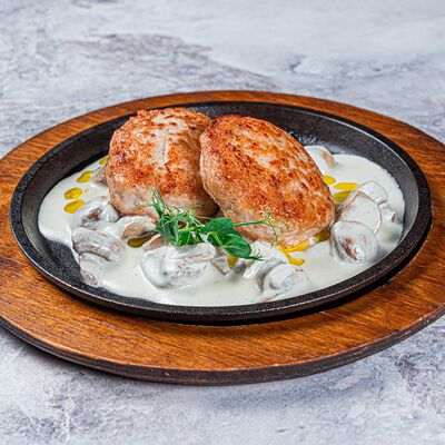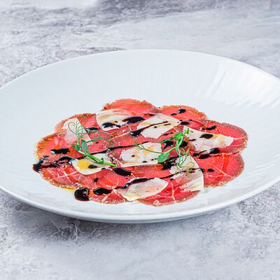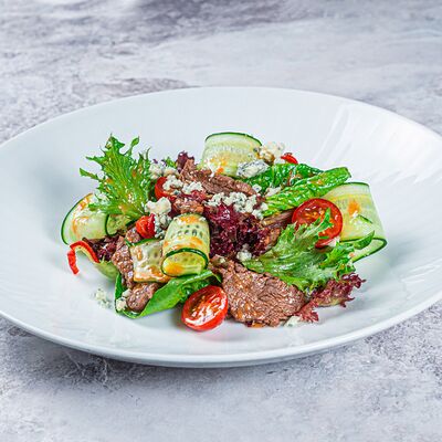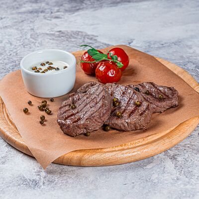 Говяжья вырезка, запеченный картофель, печеные черри, перечный соус